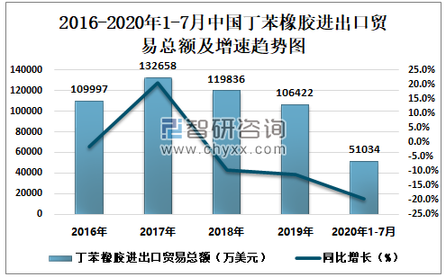 2020年1-7月中国丁苯橡胶进出口贸易总额及增速趋势图