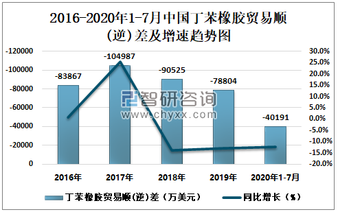 2020年1-7月中国丁苯橡胶贸易顺(逆)差及增速趋势图