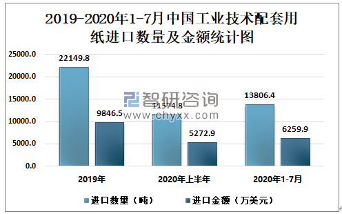 根据中国海关数据显示:2020年1-7月中国工业技术配套用纸累计进口数量为13806.4吨,同比增长15.4%;2020年1-7月中国工业技术配套用纸累计进口金额为6259.9万美元,同比增长13.4%。