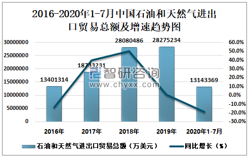 2020年1-7月中国石油和天然气进出口贸易总额及增速趋势图