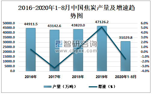 2016-2020年1-8月中国焦炭产量及增速趋势图