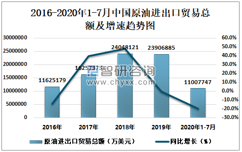 2020年1-7月中国原油进出口贸易总额及增速趋势图