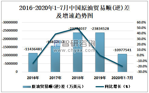 2020年1-7月中国原油贸易顺(逆)差及增速趋势图