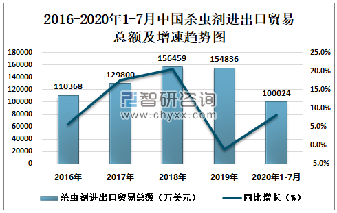 2020年1-7月中国杀虫剂进出口贸易总额及增速趋势图
