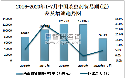 2020年1-7月中国杀虫剂贸易顺(逆)差及增速趋势图