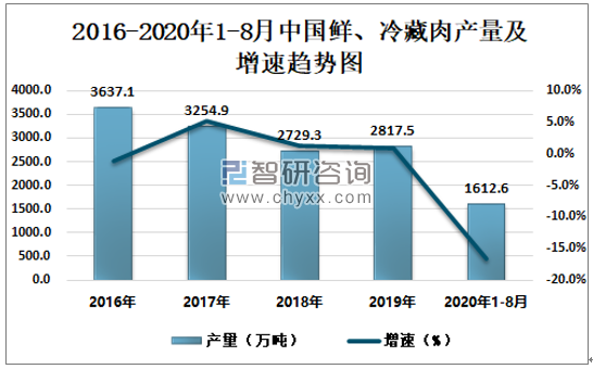 根据国家统计局数据显示:2020年8月中国鲜、冷藏肉产量为206.5万吨,同比下降11.3%;2020年1-8月中国鲜、冷藏肉产量为1612.6万吨,同比下降16.7%。