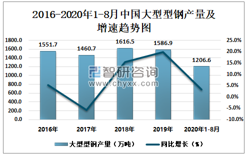 2016-2020年1-8月中国大型型钢产量及增速趋势图