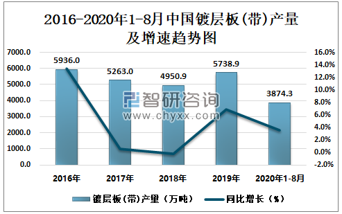 2016-2020年1-8月中国镀层板(带)产量及增速趋势图