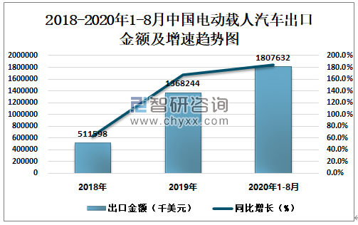 根据中国海关数据显示:2020年1-8月中国电动载人汽车出口数量为113733辆,同比下降31.8%;2020年1-8月中国电动载人汽车出口金额为1807632千美元,同比增长184.2%。