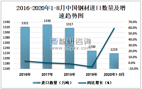 2016-2020年1-8月中国钢材进口数量及增速趋势图