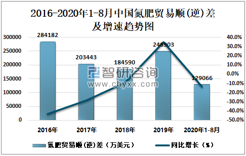 2016-2020年1-8月中国氮肥贸易顺(逆)差及增速趋势图