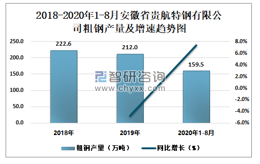 2018-2020年1-8月安徽省贵航特钢有限公司粗钢产量及增速趋势图