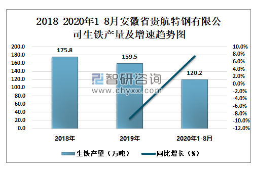 2018-2020年1-8月安徽省贵航特钢有限公司生铁产量及增速趋势图