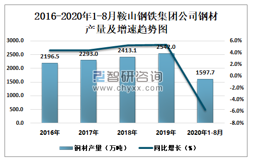 2016-2020年1-8月鞍山钢铁集团公司钢材产量及增速趋势图