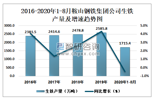 2016-2020年1-8月鞍山钢铁集团公司生铁产量及增速趋势图
