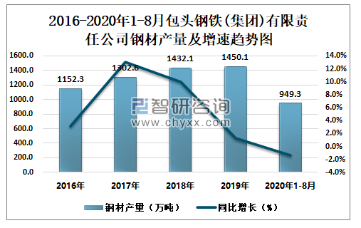 2016-2020年1-8月包头钢铁(集团)有限责任公司钢材产量及增速趋势图