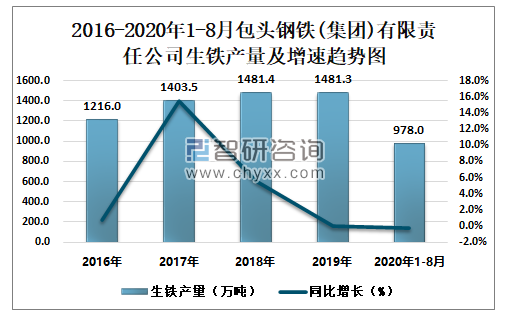 2016-2020年1-8月包头钢铁(集团)有限责任公司生铁产量及增速趋势图
