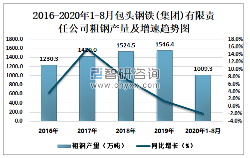2016-2020年1-8月包头钢铁(集团)有限责任公司粗钢产量及增速趋势图