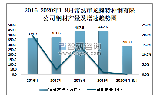 2016-2020年1-8月常熟市龙腾特种钢有限公司钢材产量及增速趋势图