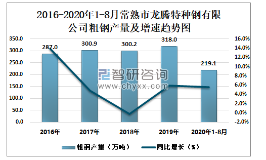 2016-2020年1-8月常熟市龙腾特种钢有限公司粗钢产量及增速趋势图