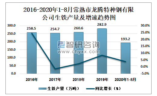 2016-2020年1-8月常熟市龙腾特种钢有限公司生铁产量及增速趋势图