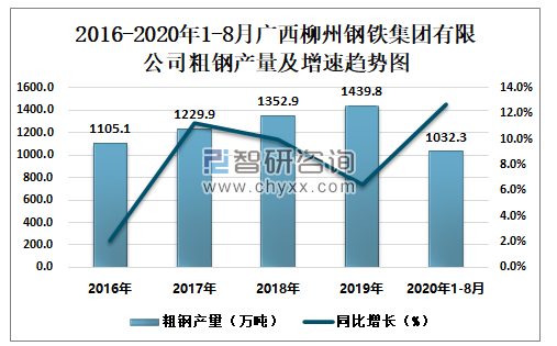 2016-2020年1-8月广西柳州钢铁集团有限公司粗钢产量及增速趋势图