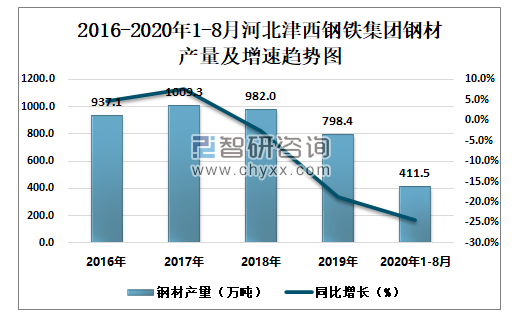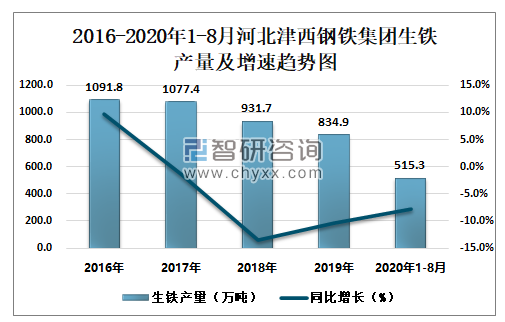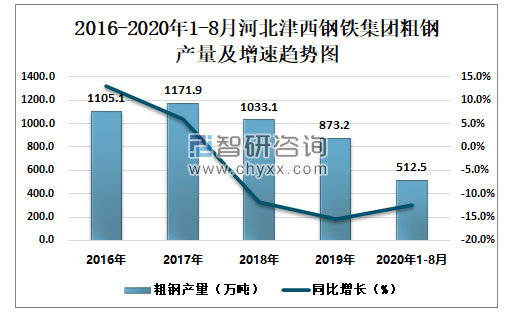根据冶金工业信息中心数据显示:2020年1-8月河北津西钢铁集团钢材产量为411.5万吨,同比下降24.5%;粗钢产量为512.5万吨,同比下降12.5%;生铁产量为515.3万吨,同比下降7.8%。