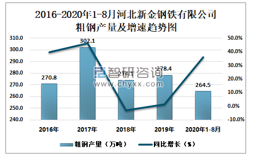 根据冶金工业信息中心数据显示:2020年1-8月河北新金钢铁有限公司钢材产量为333.5万吨,同比增长27.0%;粗钢产量为264.5万吨,同比增长36.1%;生铁产量为257.7万吨,同比增长53.3%。