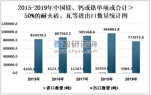 根据中国海关数据显示:2019年1-12月中国镁、钙或铬单项或合计>50%的耐火砖、瓦等进口数量为7084.7吨,进口金额为1504.6万美元;2019年1-12月中国镁、钙或铬单项或合计>50%的耐火砖、瓦等出口数量为773971.6吨,出口金额为86133.9万美元。