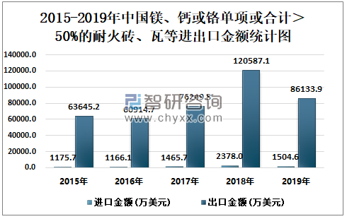 2015-2019年中国镁、钙或铬单项或合计>50%的耐火砖、瓦等 进出口金额统计图