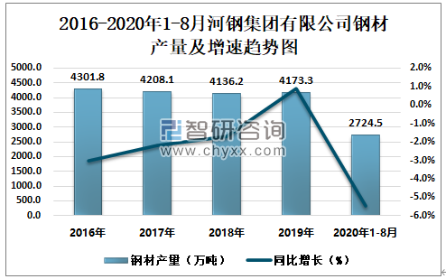 2016-2020年1-8月河钢集团有限公司钢材产量及增速趋势图