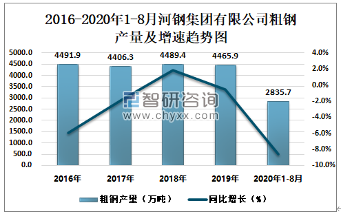 根据冶金工业信息中心数据显示:2020年1-8月河钢集团有限公司钢材产量为2724.5万吨,同比下降5.5%;粗钢产量为2835.7万吨,同比下降8.6%;生铁产量为2686.6万吨,同比下降4.9%。