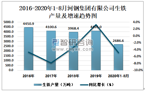 2016-2020年1-8月河钢集团有限公司生铁产量及增速趋势图