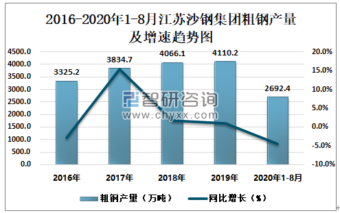 根据冶金工业信息中心数据显示:2020年1-8月江苏沙钢集团钢材产量为2675.1万吨,同比下降1.7%;粗钢产量为2692.4万吨,同比下降4.4%;生铁产量为2254.8万吨,同比下降1.3%。