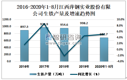 2016-2020年1-8月江西萍钢实业股份有限公司生铁产量及增速趋势图
