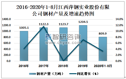 2016-2020年1-8月江西萍钢实业股份有限公司钢材产量及增速趋势图