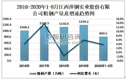 根据冶金工业信息中心数据显示:2020年1-8月江西萍钢实业股份有限公司钢材产量为809.9万吨,同比增长3.4%;粗钢产量为809.5万吨,同比增长3.8%;生铁产量为682.7万吨,同比增长5.1%。