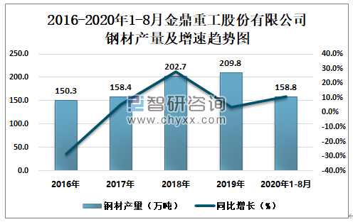 2016-2020年1-8月金鼎重工股份有限公司钢材产量及增速趋势图
