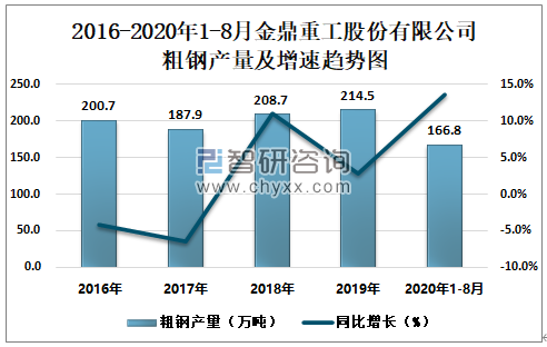 2016-2020年1-8月金鼎重工股份有限公司粗钢产量及增速趋势图