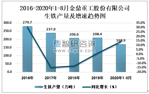 2016-2020年1-8月金鼎重工股份有限公司生铁产量及增速趋势图