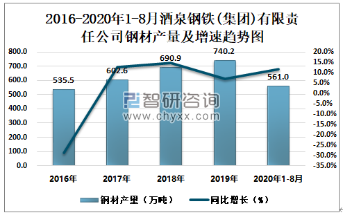 2016-2020年1-8月酒泉钢铁(集团)有限责任公司钢材产量及增速趋势图