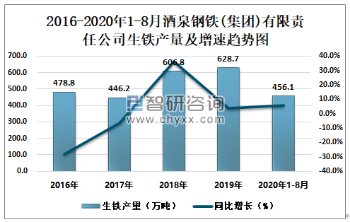 2016-2020年1-8月酒泉钢铁(集团)有限责任公司生铁产量及增速趋势图