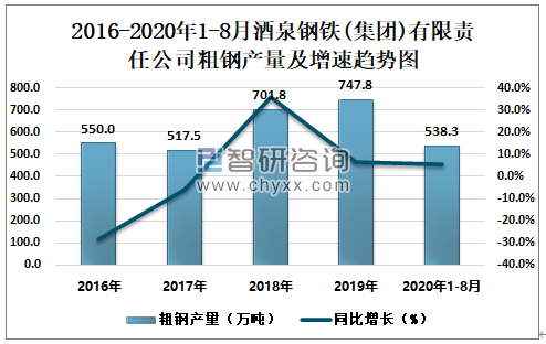 2016-2020年1-8月酒泉钢铁(集团)有限责任公司粗钢产量及增速趋势图
