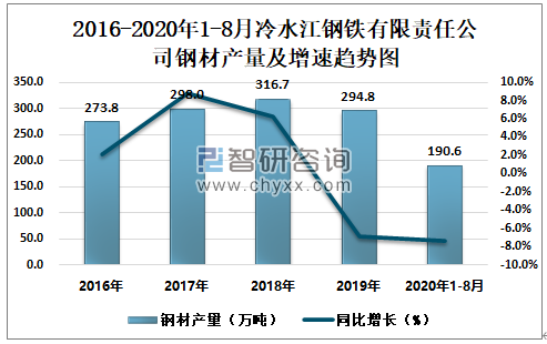 2016-2020年1-8月冷水江钢铁有限责任公司钢材产量及增速趋势图