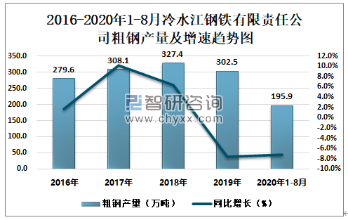 2016-2020年1-8月冷水江钢铁有限责任公司粗钢产量及增速趋势图