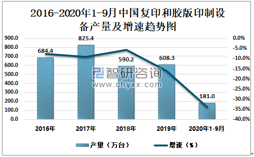 2016-2020年1-9月中国复印和胶版印制设备产量及增速趋势图