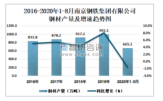 根据冶金工业信息中心数据显示:2020年1-8月南京钢铁集团有限公司钢材产量为665.1万吨,同比下降1.5%;粗钢产量为754.9万吨,同比增长2.9%;生铁产量为689.9万吨,同比增长5.3%。