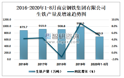 2016-2020年1-8月南京钢铁集团有限公司生铁产量及增速趋势图