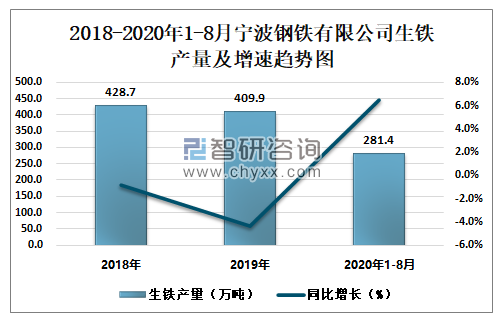 2018-2020年1-8月宁波钢铁有限公司生铁产量及增速趋势图