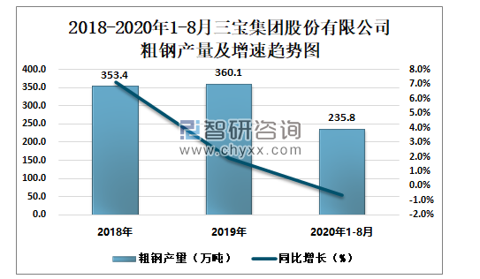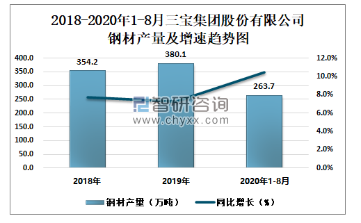 根据冶金工业信息中心数据显示:2020年1-8月三宝集团股份有限公司钢材产量为263.7万吨,同比增长10.5%;粗钢产量为235.8万吨,同比下降0.6%;生铁产量为144.0万吨,同比下降0.9%。
